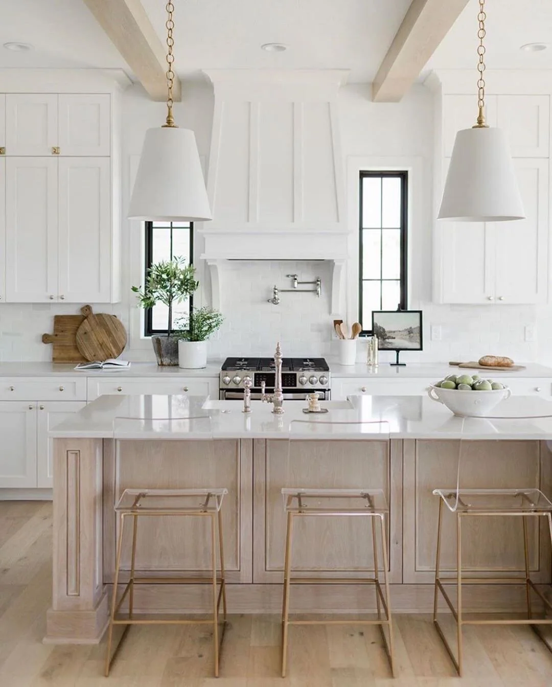 Here are three simple tips if you’re ready to elevate your kitchen’s style! Below you will notice that all the kitchen examples feature the same key elements, which are pendant lights, bar stools, and rugs. I’ve also added a few ideas for smaller styling pieces at the end. Enjoy!